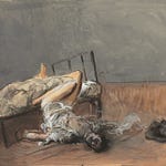 I don’t remember where I came up with the idea of a burning swing, but I imagined it as an old wooden swing hanging under a willow tree next to a small lake. But it’s on fire, and a man wallowing in his shame is making a home on this swing that’s on fire.